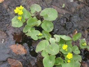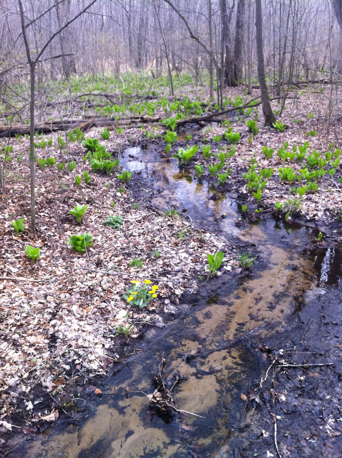 The topography of the south central Great Lakes region was shaped by the glaciers which left large moraines and small hillocks of dry soil with lowland wet areas in between, and one can readily see this landscape in the spring at Nan Weston Preserve. Before the trees leaf in, skunk cabbage and a few small wildflowers provide the only green. Pools of water and streams are dark on the landscape, and the bare grey trunks of trees provide vertical definition. Up above, warblers and other songbirds flit about.