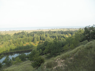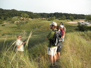 On a recent Sunday evening I was fortunate to go on a guided walk through the 171-acre natural area and enjoyed both the feel of an expansive sky and an undulating landscape. Being out in the open in Michigan usually means a farm field, a restored prairie, or an open boat in an inland lake. These surfaces are flat; the Saugatuck dunes are not. As one climbs over a small rise, or around a low dune, new scenes appear: a lone oak tree standing in dune grass, a pair of monarch butterflies rising, or a small marsh adding texture and color. These inter-dune wetlands are home to some unique plants as well as the rare Blanchard’s cricket frog. The backdrop to these low coastal dunes are, on the one side, high, tree covered dunes, and on the other, limitless Lake Michigan.