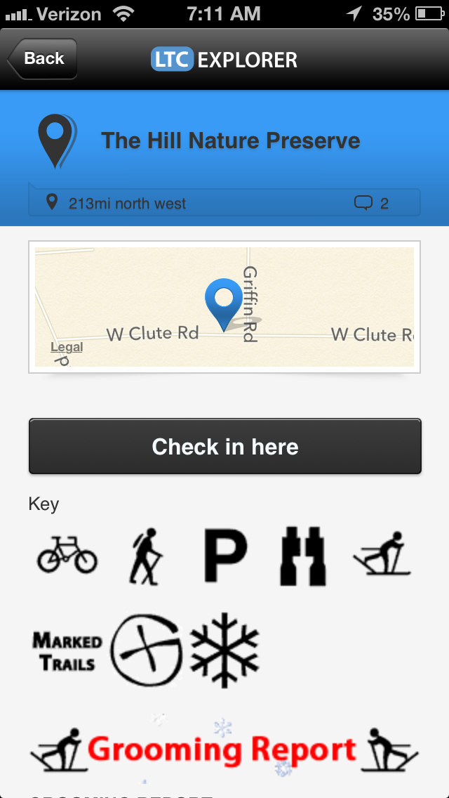 Another of Michigan’s excellent land trusts, the Little Traverse Conservancy, has a useful app, LTC Explorer, that provides an in-hand user guide to northwest Michigan and parts of the Eastern UP. I recently put it and my iPhone to the test on a winter weekend in the Boyne City-Petoskey area. The first day out, four of us loaded up our cross-country skis and headed first to Young State Park on Lake Charlevoix. The DNR’s app provided the location; the little nordic skier logo let us know we could expect to enjoy this activity, which we did by following the many tracks of previous skiers on several miles of trail. The highlight was a detour to ski on the frozen lake and make snow angels.