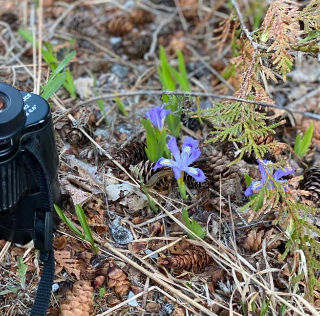 It’s organic, a flower. But here, right on the driveway and not back in the woods? I get closer and recognize the plant from the garden at home. But this is wrong, the flowers are too small, too close to the ground, and amidst ground pine. Then it occurs to me. I have heard of this flower, oft-mentioned by conservationists who love the shoreline of the Great Lakes. I am a convert. I am in the right place. This is the dwarf lake iris.