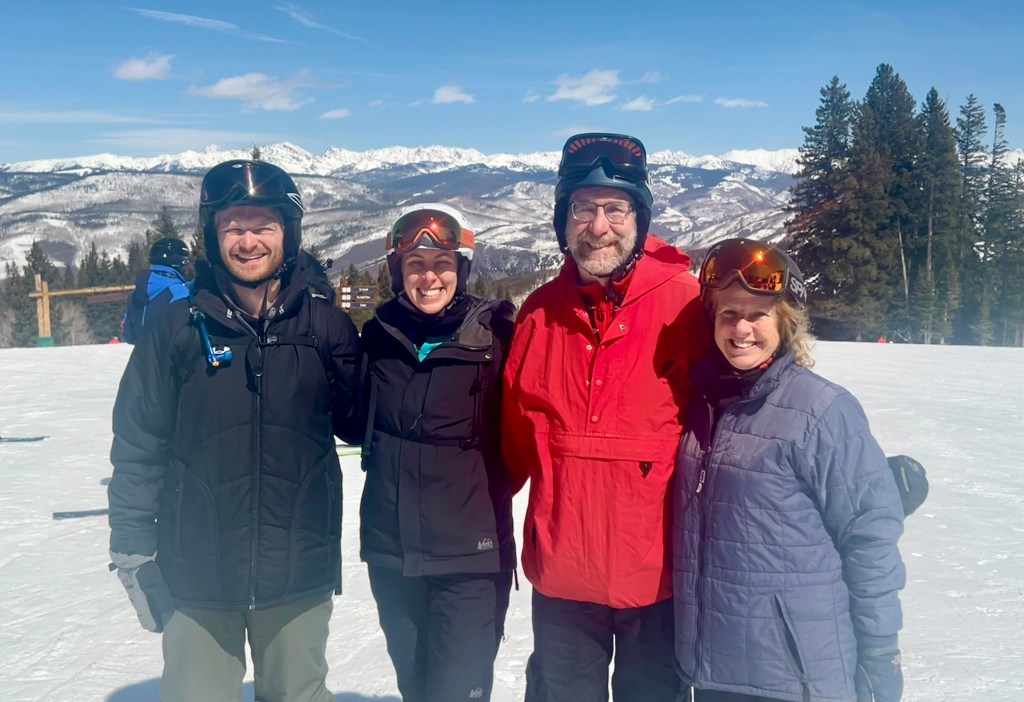 Abbie and I made it another year. This March, we skied at Beaver Creek, a somewhat newer resort I don’t think you ever visited. The same thrill was there again, and this time with our partners. Anna was back on the slopes after a four-year hiatus, putting a damaged knee to the test (successfully!) and Eduard, a relatively new skier, had gained enough skill to keep up with us all. With gentle hills stretching off to the north, most of the views were not as grand as they are in the Tenmile Range, but the Gore Range at a distance to the east provided a Rocky Mountain backdrop.