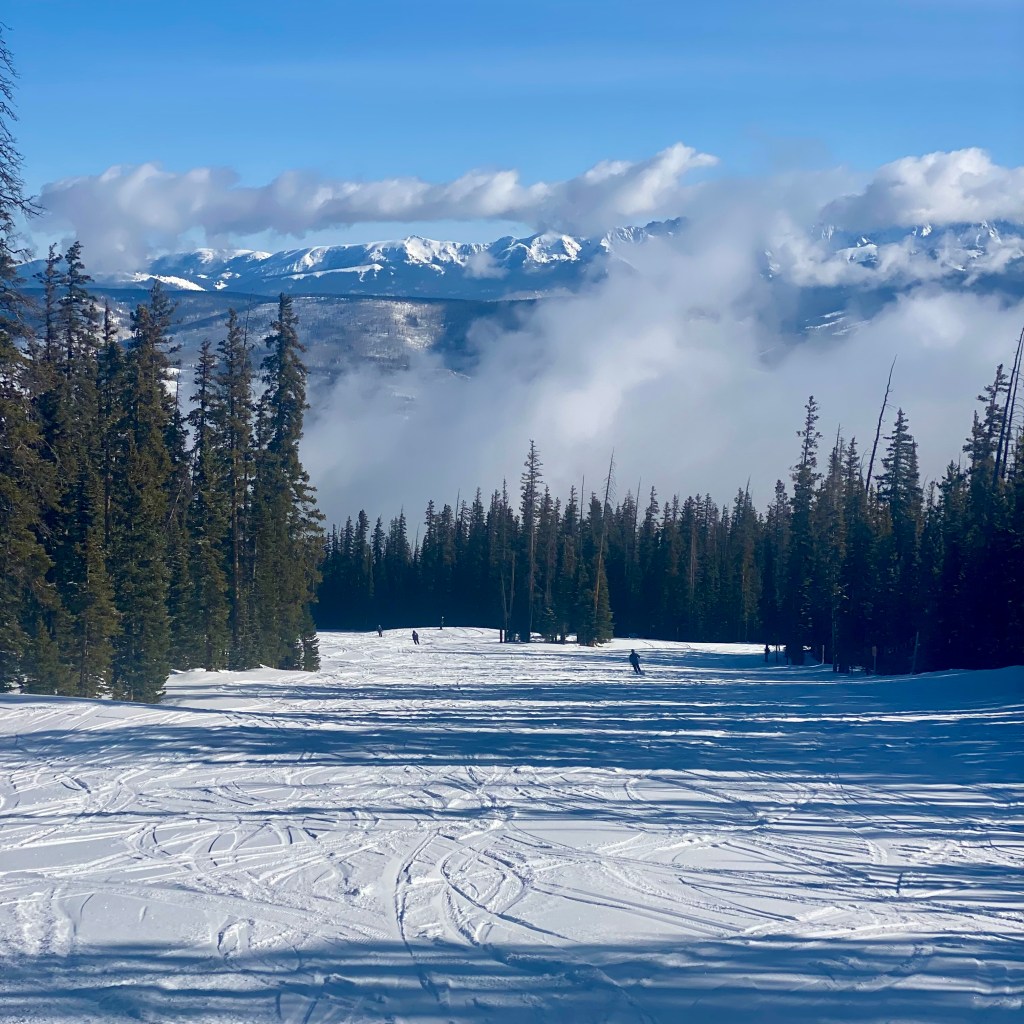 In Colorado without you, the skiing still captivated me. In the morning there was the high altitude dichotomy of warm sun and bracing air, yesterday’s slush in the gondola line now crunching underfoot. We applied sunscreen and adjusted gloves and hat as we rode up into the alpine zone, passing tall pines, orange-brown poles adorned with dark green branches weighed down with small heaps of snow. The horizon was upright, jagged, a jumble of white peaks, forested slopes, snowy chutes, and harsh rocks.